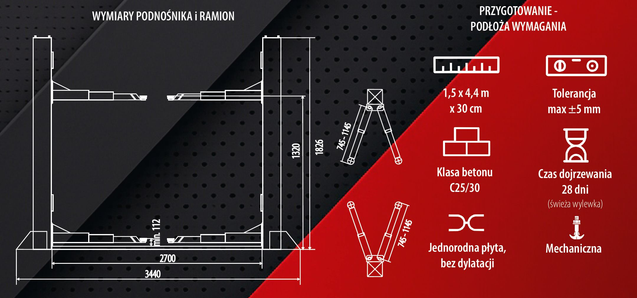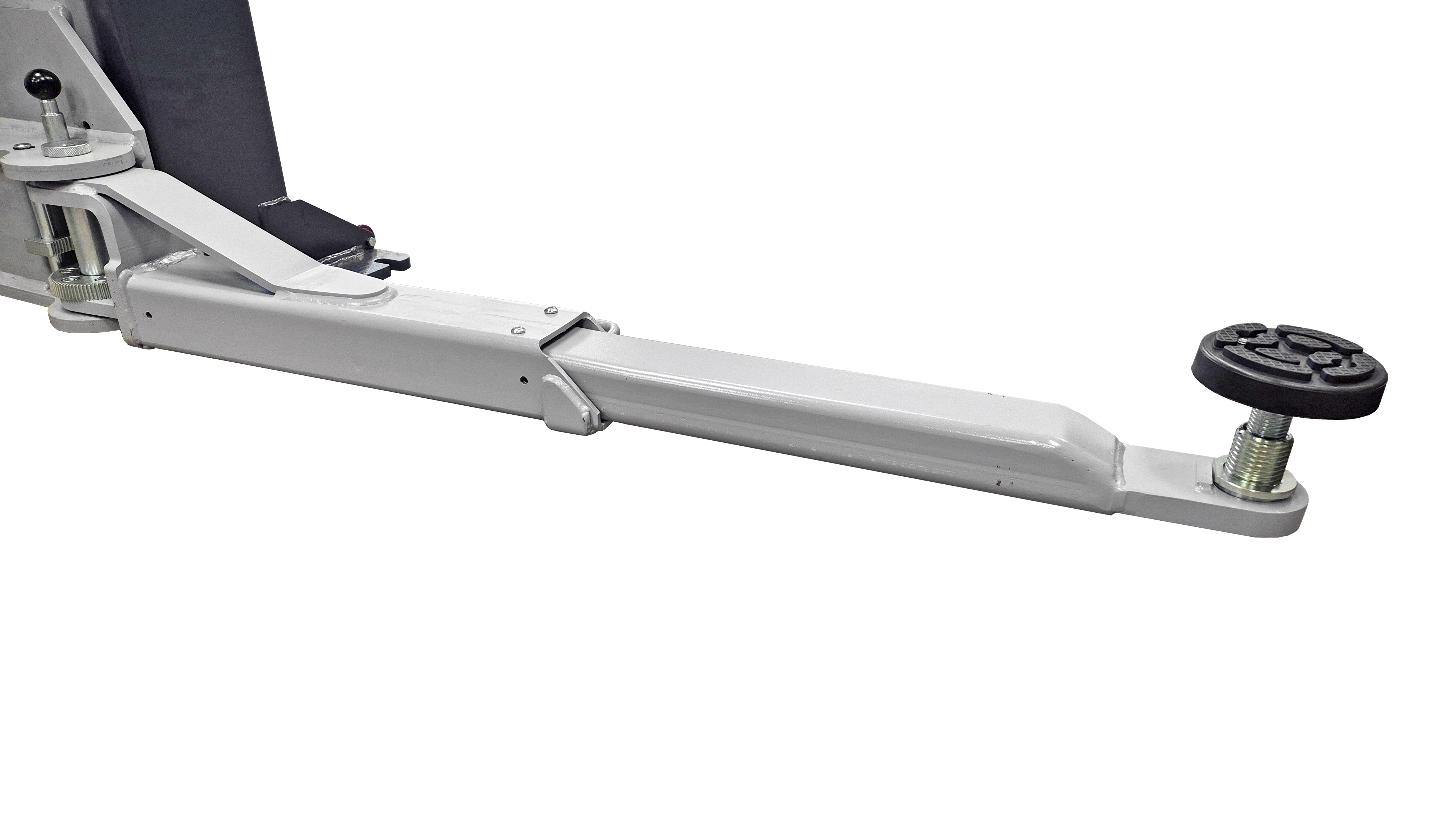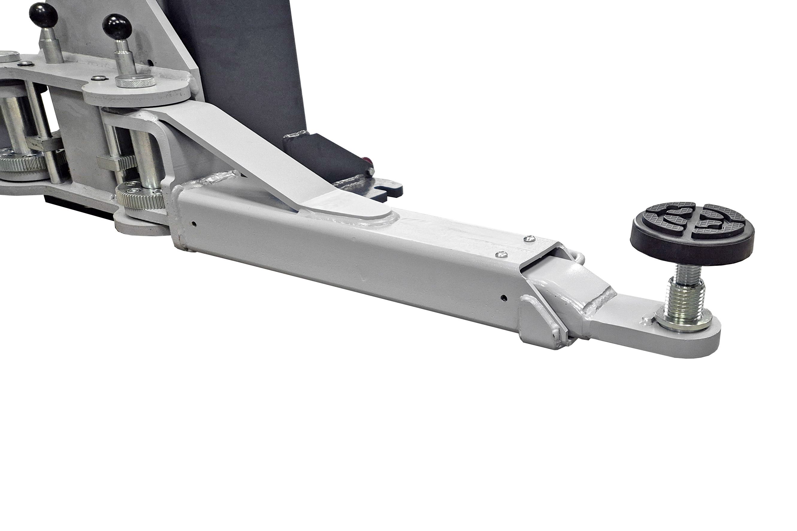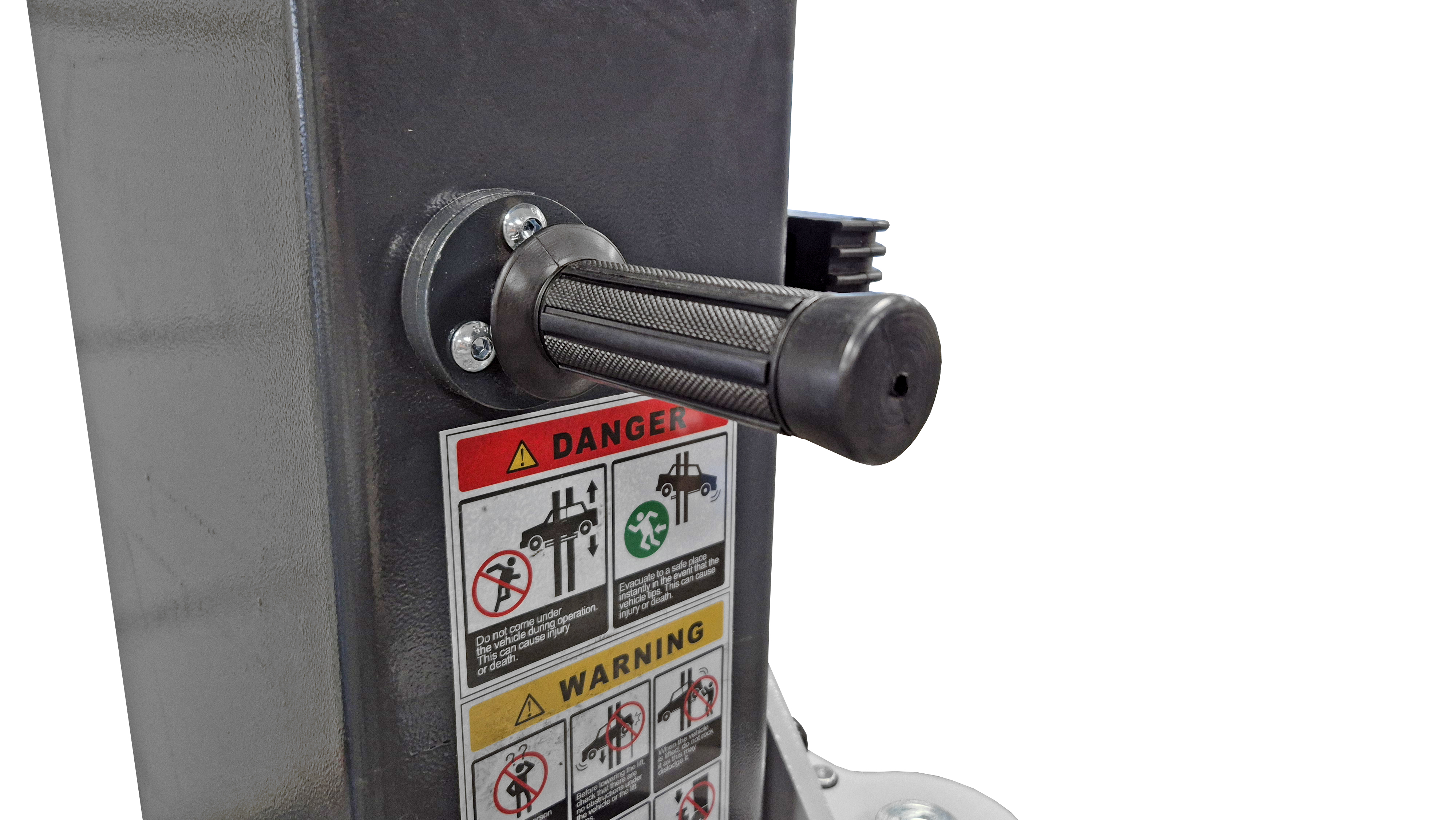 Podnośnik gwarantuje bezpieczeństwo dzięki ręcznej blokadzie wysokości i ramion, a synchronizacja mechaniczna odpowiada za idealnie równe podnoszenie.