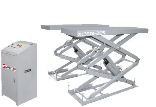 Podnośnik elektrohydrauliczny GRUBBER XL350I-2ES cechuje się stabilną konstrukcją nośną oraz mechaniczną blokadą wysokości zwalnianą pneumatycznie, co gwarantuje bezpieczeństwo i wygodę pracy.